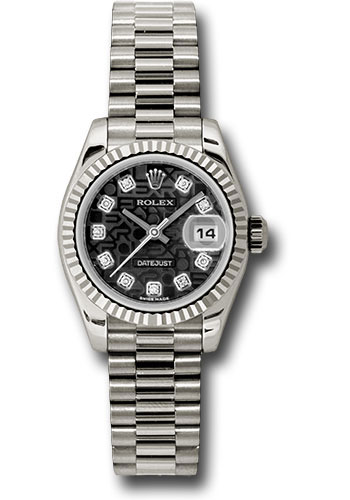 Rolex White Gold Lady-Datejust 26 Watch - Fluted Bezel - Black Jubilee Diamond Dial - President Bracelet