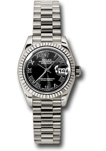 Rolex White Gold Lady-Datejust 26 Watch - Fluted Bezel - Black Roman Dial - President Bracelet