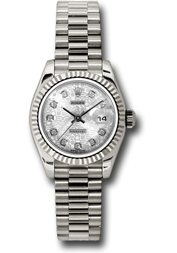 Rolex White Gold Lady-Datejust 26 Watch - Fluted Bezel - Silver Jubilee Diamond Dial - President Bracelet