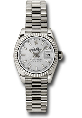Rolex White Gold Lady-Datejust 26 Watch - Fluted Bezel - Silver Index Dial - President Bracelet