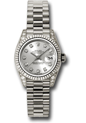 Rolex White Gold Lady-Datejust 26 Watch - Fluted Bezel - Silver Diamond Dial - President Bracelet