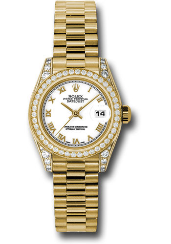 Rolex Yellow Gold Lady-Datejust 26 Watch - 42 Diamond Bezel - White Roman Dial - President Bracelet