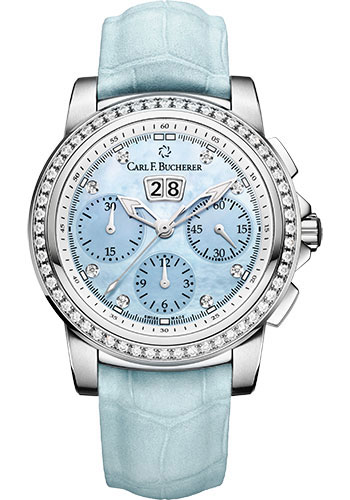 Carl F. Bucherer Patravi ChronoDate Watch - 40 mm Steel Diamond Case - Blue Mother-Of-Pearl Dial - Blue Alligator Strap